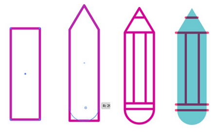 讓我們創(chuàng)建一個(gè)彩色鉛筆圖標(biāo)。畫(huà)一個(gè)矩形。在頂部邊緣添加一個(gè)錨點(diǎn),然后使用直接選擇工具將其向上拉。通過(guò)向內(nèi)拉動(dòng)角,將矩形的底部四舍五入。添加垂直和水平線段以創(chuàng)建鉛筆的詳細(xì)信息和部分。