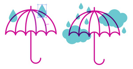 對(duì)于您已創(chuàng)建的圖標(biāo),讓我們添加有趣的色彩!雨滴是簡(jiǎn)單的圓圈,其頂部錨點(diǎn)向上拉。云由多個(gè)重疊并聯(lián)合在一起的圓形成。確保填充顏色設(shè)置為“正片疊底”,并且您的顏色選擇可以很好地協(xié)同工作。互補(bǔ)色或類(lèi)似色彩通常是不錯(cuò)的選擇。