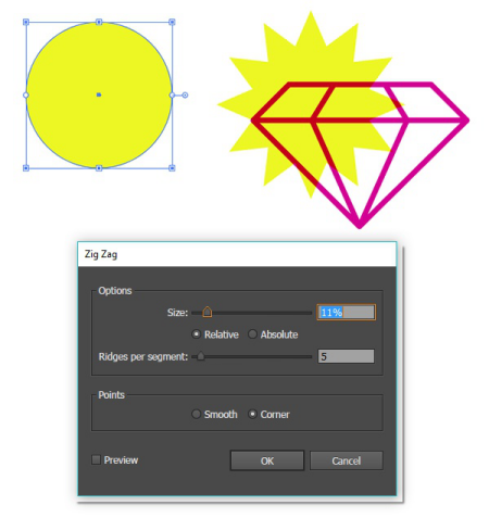 對(duì)于閃亮的鉆石,畫(huà)一個(gè)圓圈并在你的圓圈上應(yīng)用Zig Zag效果。我選擇每段5個(gè)脊,大小為11%。根據(jù)您的需要試驗(yàn)?zāi)男Ч?