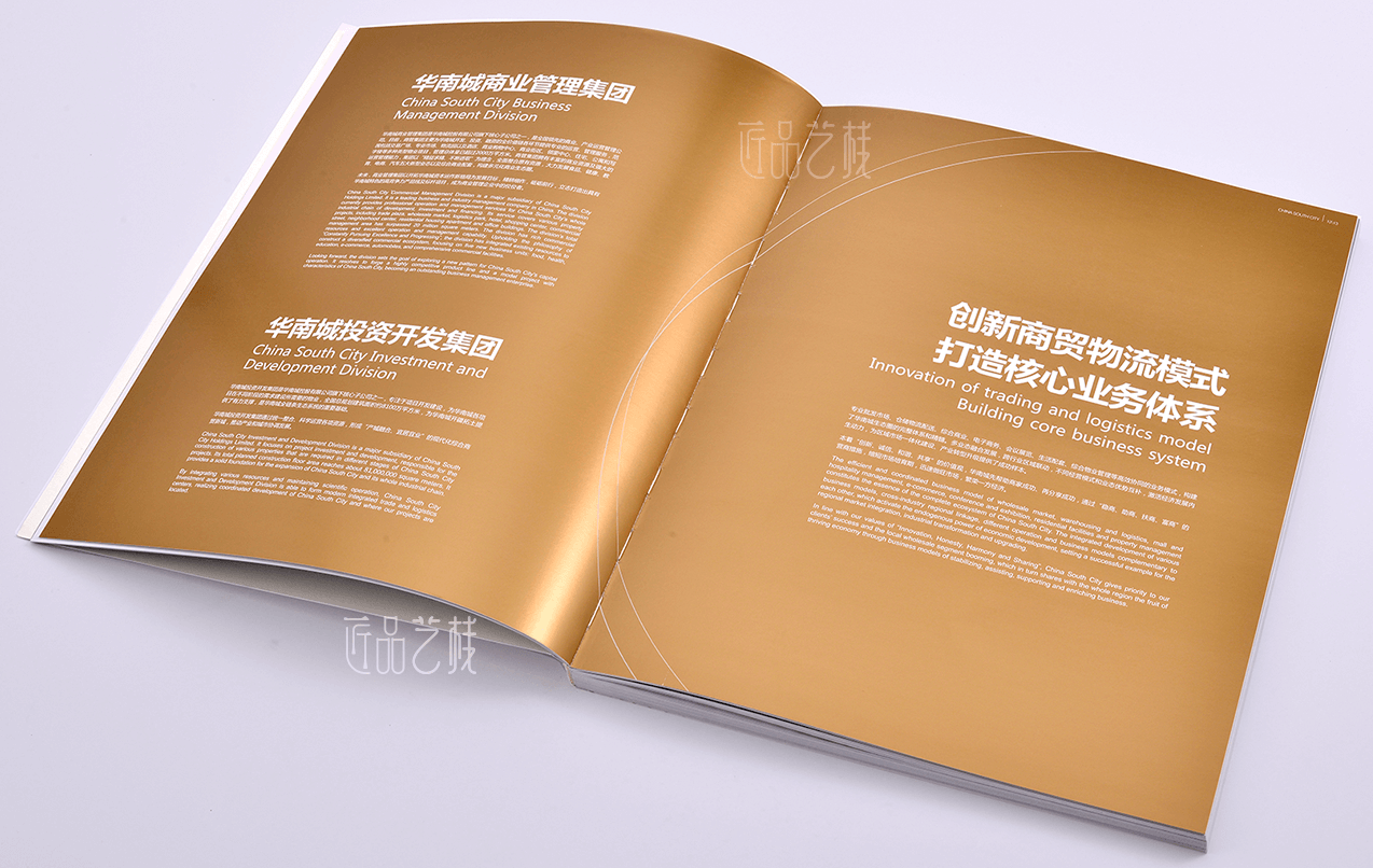 華南城控股有限公司是一家在香港聯(lián)合交易所上市的綜合商貿(mào)物流企業(yè)是中國規(guī)劃、建設(shè)、運營大型綜合商貿(mào)物流中心的領(lǐng)航者,在此畫冊印刷,針對業(yè)務(wù)涵蓋多領(lǐng)域等生態(tài)系統(tǒng)特征,采用專金、專銀等印刷,以及特種紙、燙紅金等特色工藝搭配,準(zhǔn)確的體現(xiàn)出華南城集團(tuán)的品牌實力和宣傳特色。