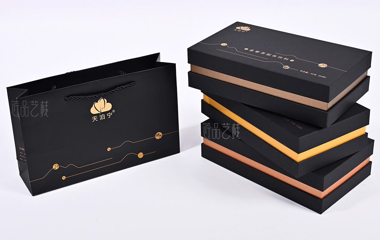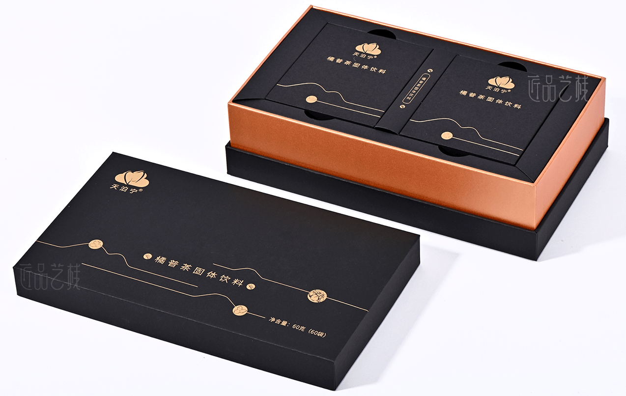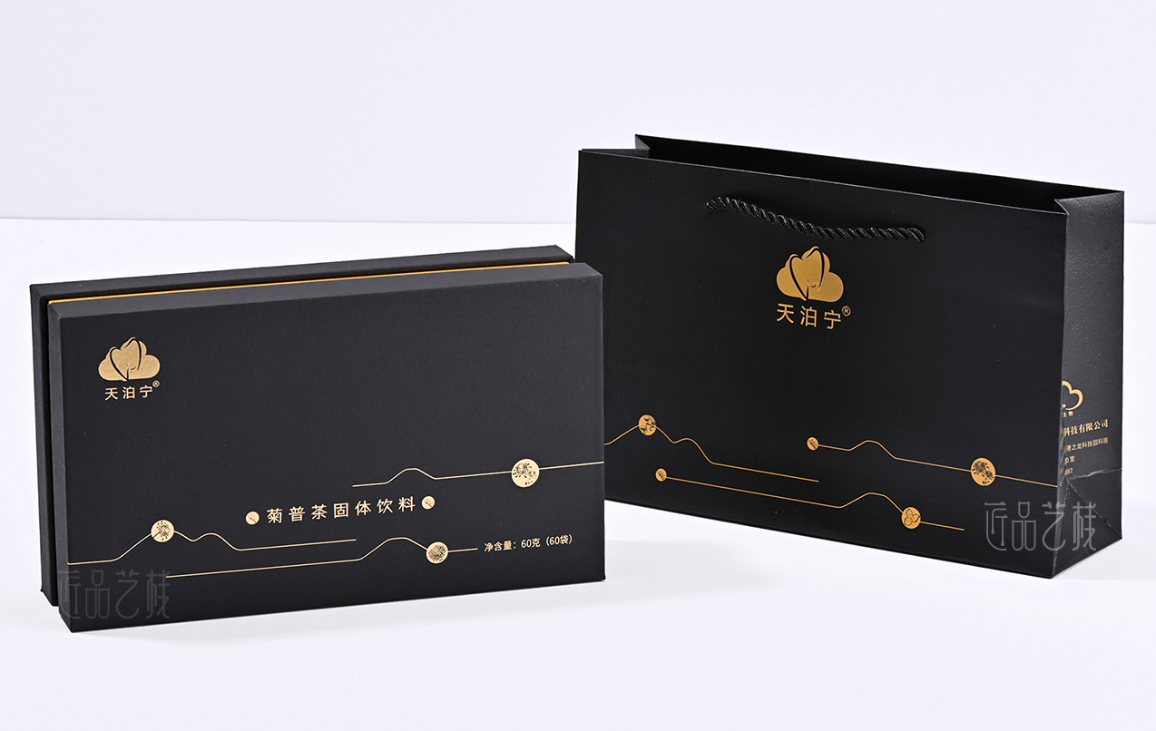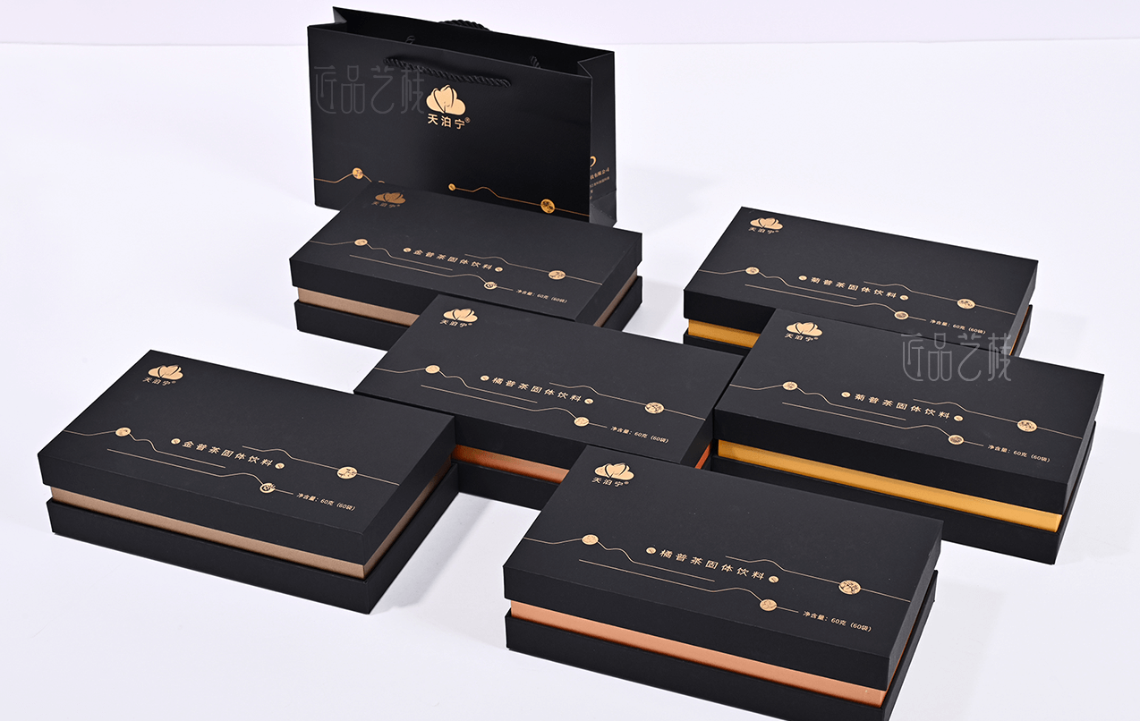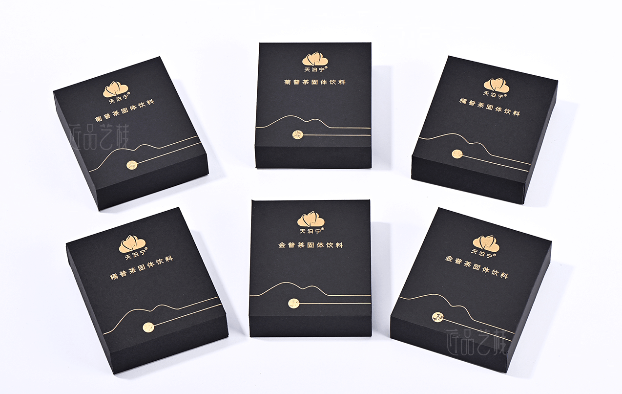天泊寧茯苓普洱茶粉固體飲料品牌,選用云南高海拔優(yōu)質(zhì)大葉種普洱茶、上等優(yōu)質(zhì)茯苓為原料,經(jīng)現(xiàn)代生物技術(shù)加工而成。在其系列產(chǎn)品包裝盒設(shè)計(jì)印刷中,匠品藝棧采用普洱茶的黑色為統(tǒng)一主色,并根據(jù)不同產(chǎn)品分類(lèi)采用不同顏色腰條為區(qū)分,使其整個(gè)系列產(chǎn)品包裝盒,既能形成統(tǒng)一的品牌視覺(jué)形象,同時(shí)又區(qū)分出鮮明的產(chǎn)品特色。
