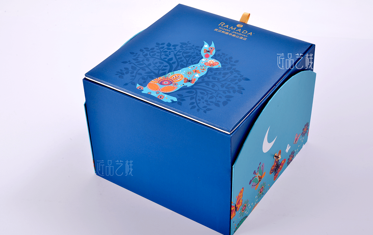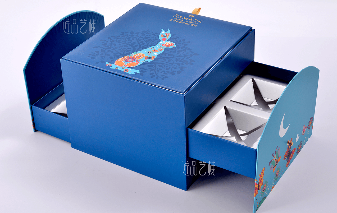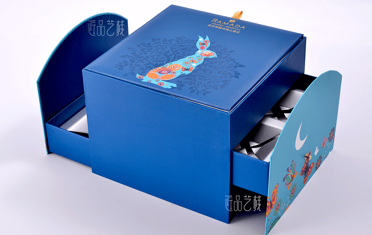 和瑞華美達酒店——昊宇集團投資,美國溫德姆酒店管理公司授權(quán)特許經(jīng)營的華美達品牌,在其中秋月餅禮盒的印刷定制中,巧妙采用雙抽屜盒的創(chuàng)意結(jié)構(gòu)模式,以原創(chuàng)繪制元素的方式,結(jié)合特種紙張和制紋工藝,使其呈現(xiàn)出高端厚重的送禮價值和品牌氣質(zhì)。