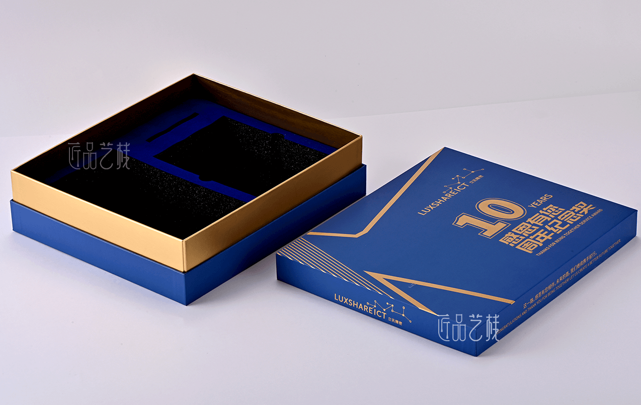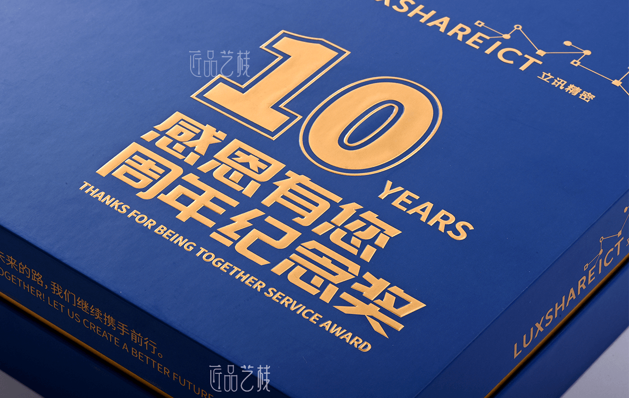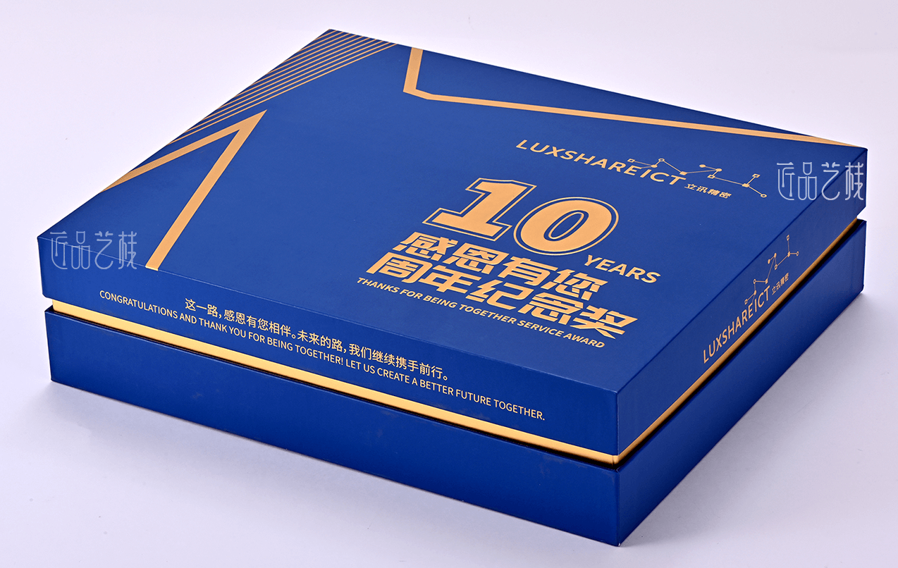 立訊精密是一家專注于連接器的研發(fā)、生產(chǎn)和銷售的國家高新技術(shù)企業(yè),今已成為中國大陸排名第一、世界排名第八的連接器生產(chǎn)商,本禮盒為其分公司10周年之際,專屬定制的周年紀(jì)念禮盒,采用海德堡專色印刷、凸金精燙等工藝,結(jié)合金色圍條與天地蓋盒形精裝制作,打造體驗(yàn)感高檔周年紀(jì)念禮盒。
